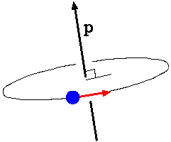 外積の話題に入る前に回転運動(回転力)の表現について整理しておこう。回転には回転軸があるので,この軸の方向で回転の方向性を表現する。 なお,ひとつの軸には二つの方向が考えられるが,回転に対して右ねじの進む向きと定義する。また,回転の度合い(運動量とか,力とか) をこのベクトルの大きさで表すことにすると,回転は図の p ベクトルのように一つのベクトル量として表現できる。